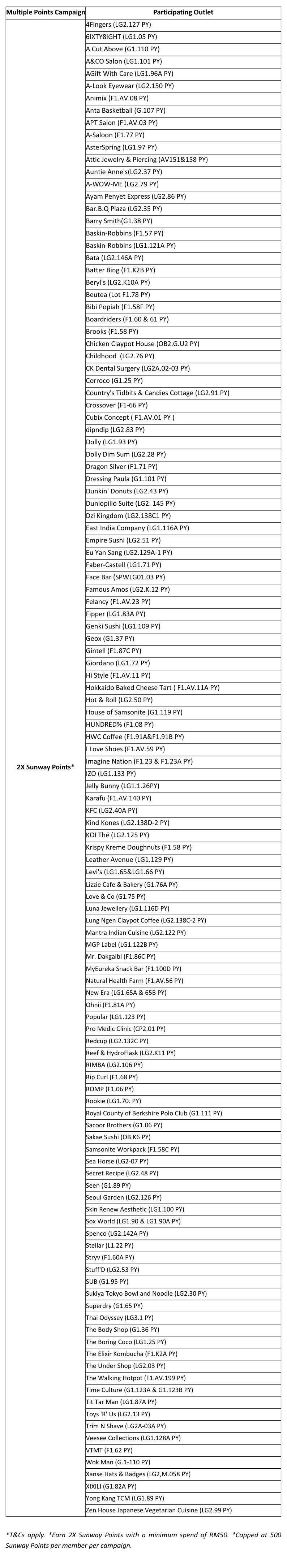 The 2X Sunway Points* reward is applicable only with a minimum spend of RM50, and capped at a maximum of 500 Sunway Points awarded to each member throughout the entire campaign or conclude once in total reaches 2,500,000 Sunway Points, whichever comes first.